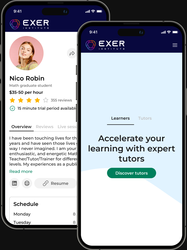Exer Institute is a tutoring platform designed to provide learners with a comprehensive learning experience while keeping sessions affordable and ensuring tutors are fairly compensated. The platform serves both learners and tutors, with a focus on giving students more control over their learning journey while creating a seamless and valuable experience for both user groups.